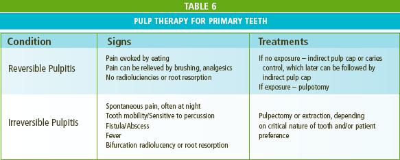 If a child presents with pain from a carious primary tooth, it is critical to determine whether the pulp has reversible or irreversible pulpitis. Those primary teeth with pain evoked by eating, but which diminishes within 1/2 hour and/or shows no signs of infection (Table 6) should be treated to preserve pulp vitality. Recent trends suggest that such teeth have better outcomes if treated initially with a caries control procedure. This is accomplished by excavating gross caries, followed by temporization with a material that covers and seals all exposed dentin. Most often after such treatment the tooth is asymptomatic, and definitive treatment can be performed several weeks later. The definitive treatment for such deep caries in primary teeth often involves careful excavation of the remaining caries trying not to expose the pulp. “Woody dentin” just above the pulp can be left (indirect pulp cap) and covered with a material that seals and stimulates reparative dentin. If excavation results in a pulp exposure, then the vital coronal pulp should be completely and treated with either formocresol, ferric sulfate or Miner trioxide aggregate (MTA). In contrast, if a child presents with spontaneous pain, especially waking the child at night, and other signs of irreversible pulpitis are present, the treatment should be pulpectomy or extraction, depending on the importance of the tooth (i.e., second primary molars that are not near exfoliation) and the desires of the parent.
